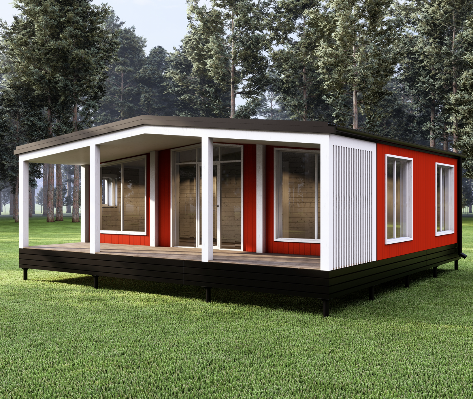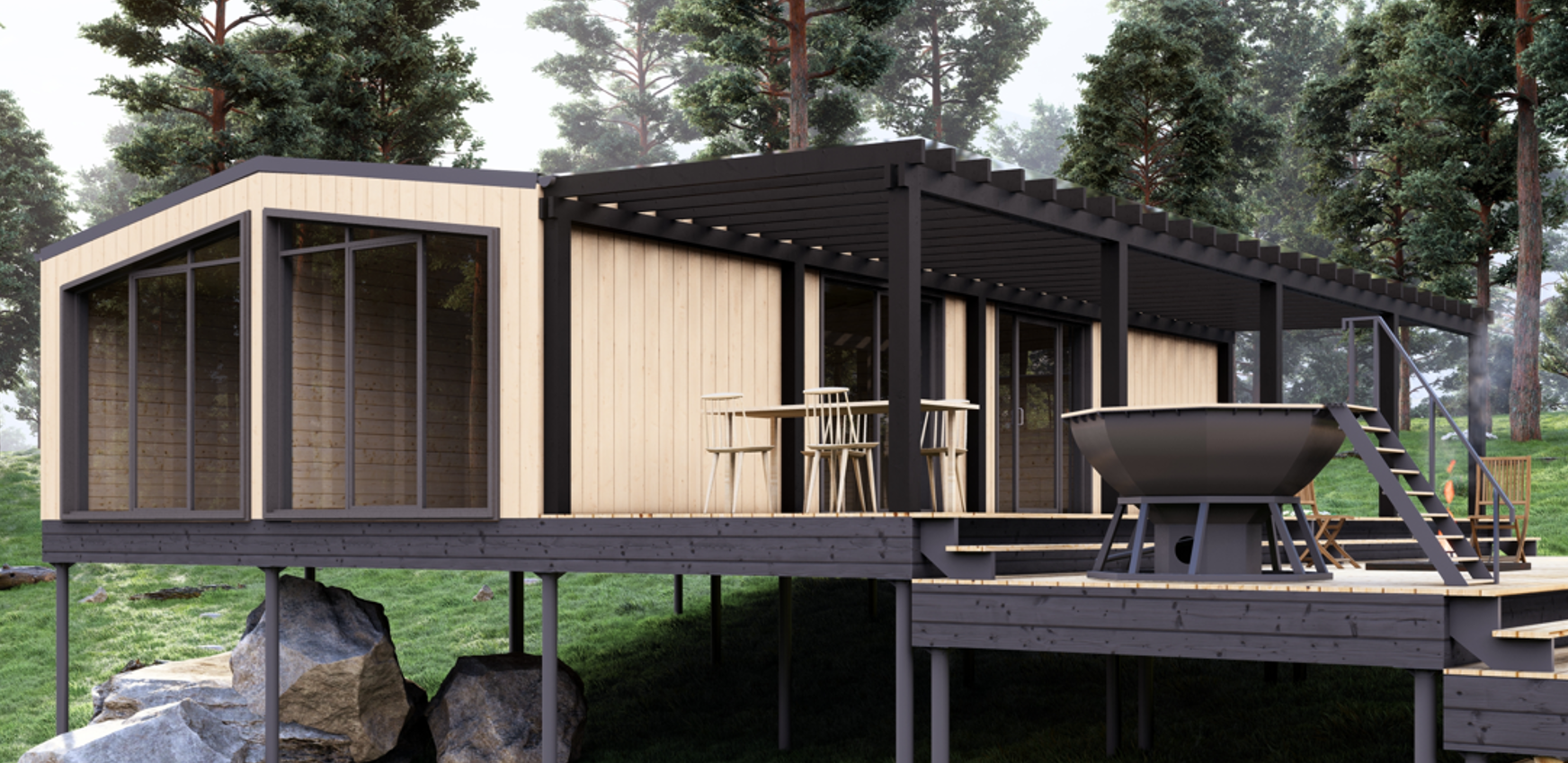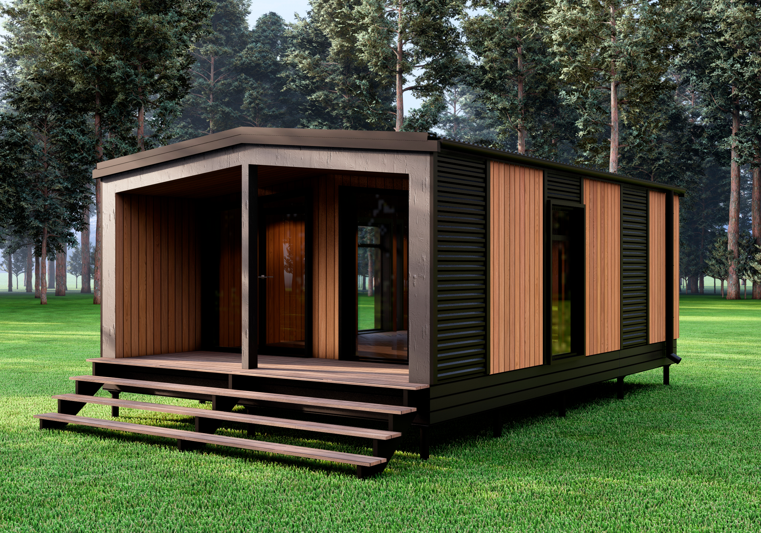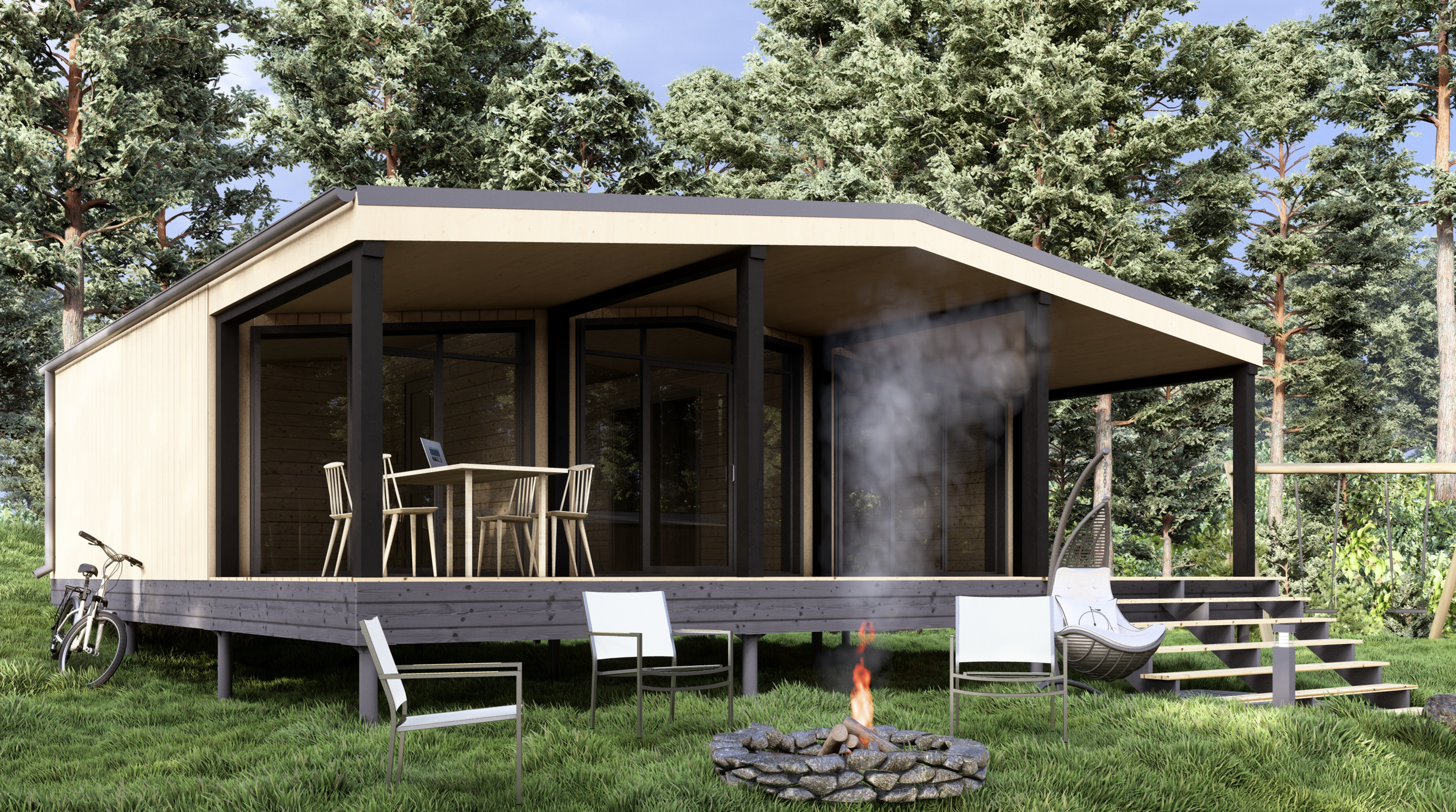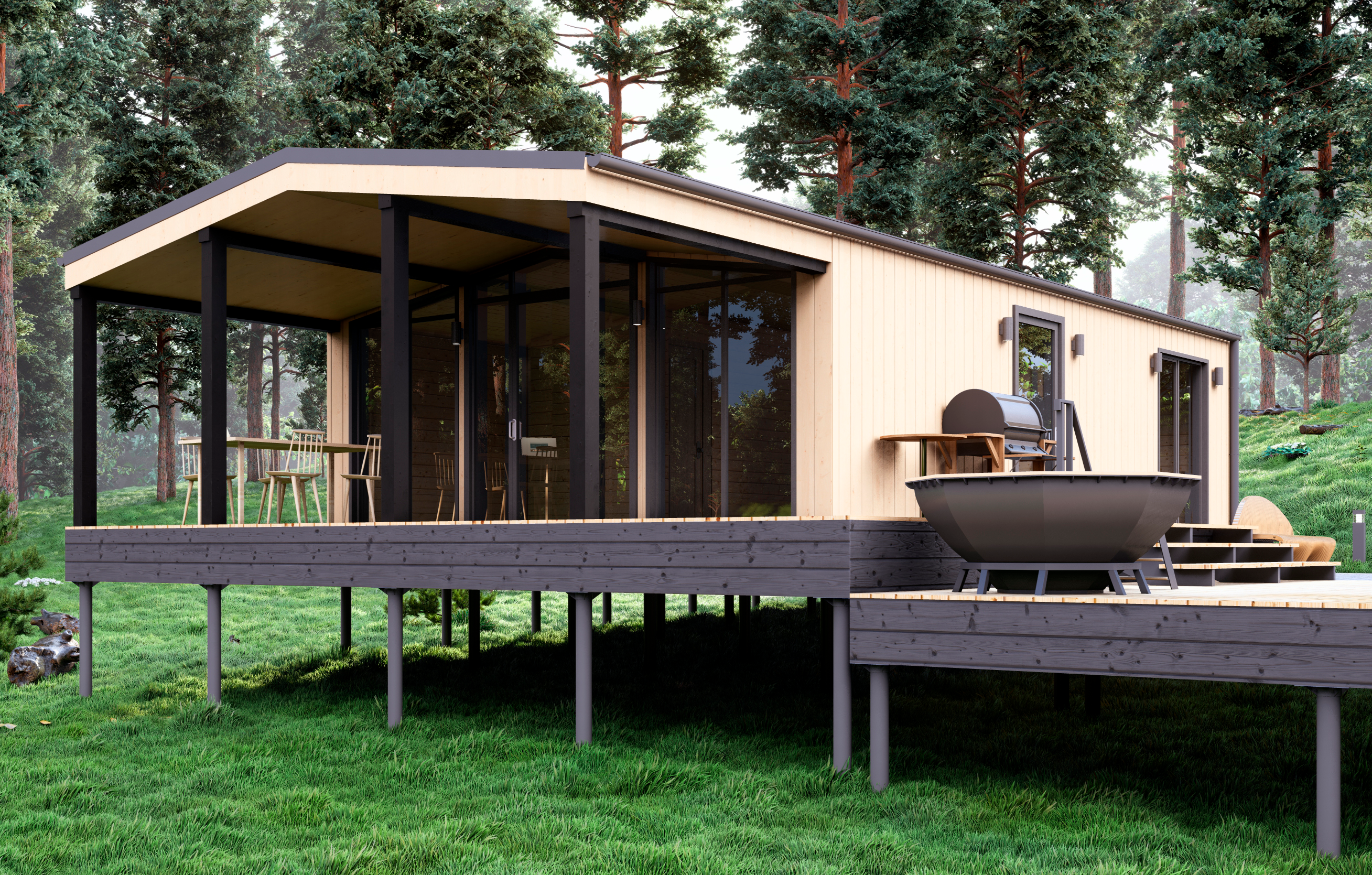 Просторная терраса с навесом — ключевая зона отдыха, где можно организовать обеденное пространство, лаунж или зону барбекю. Дом установлен на свайном фундаменте, что обеспечивает надёжность и позволяет использовать его на участках с любым рельефом.