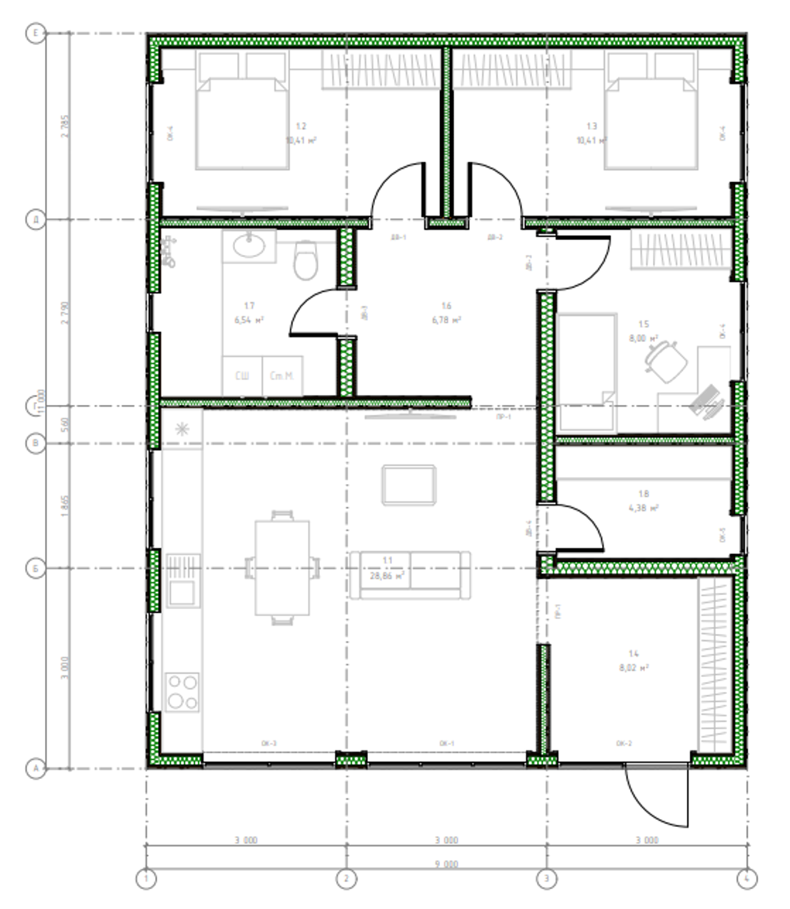 Главная особенность проекта — просторная кухня-гостиная с угловыми окнами в пол, которые создают максимальное ощущение открытого пространства и наполняют дом естественным светом.